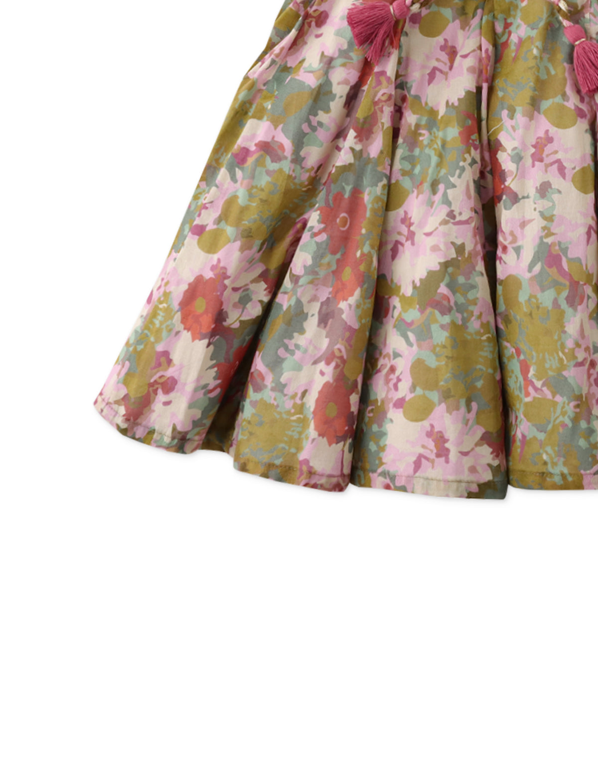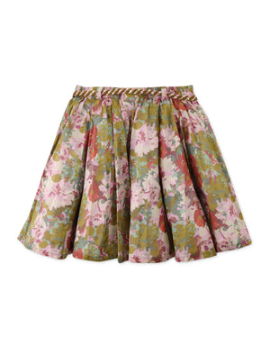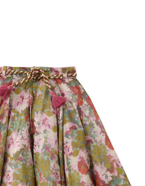 Upgrade your retro look with this cotton chiffon umbrella-cut skirt adorned with playful braided ties and a timeless floral print!