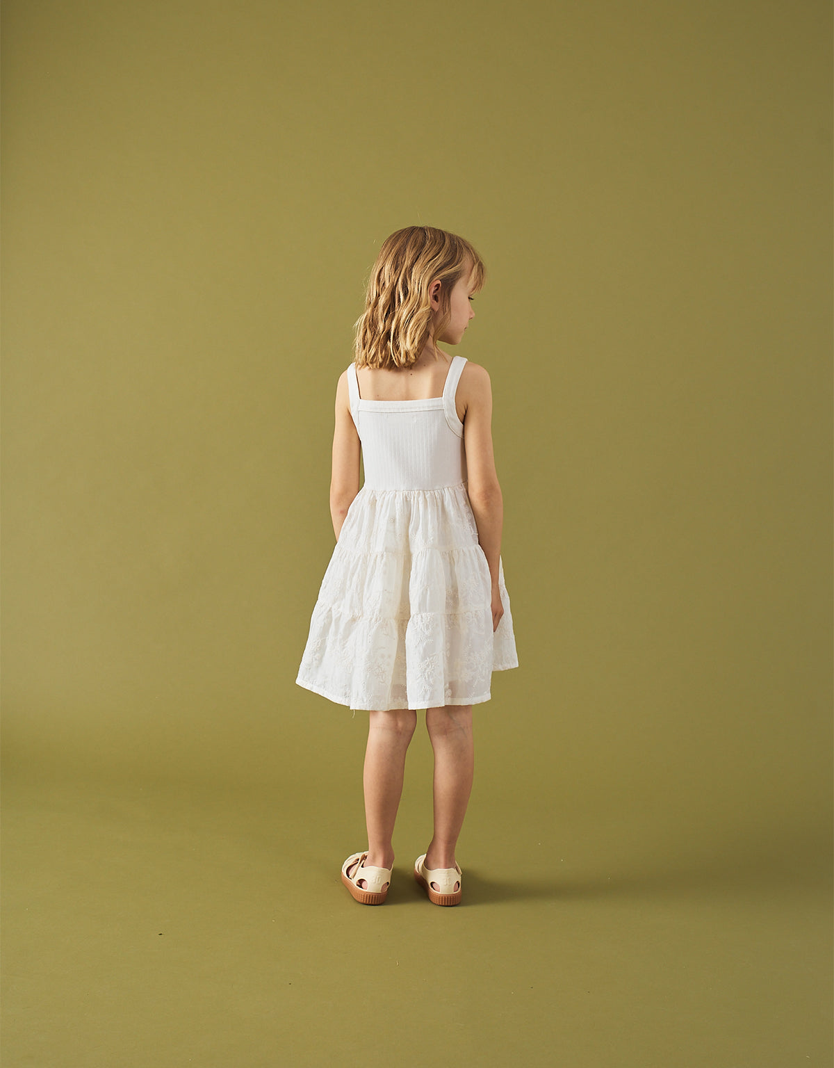 Dress your little princess in this off-white dress that weaves adorable detail into every stitch from its ribbed eyelet collar to the blooming corsage and embroidered floral tiers below, perfect for every occasion.