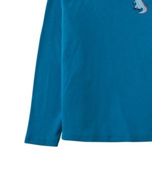 ANDREI MOCK NECK LONG SLEEVES T-SHIRT BLUE WITH EMBROIDERED T-REX DETAIL