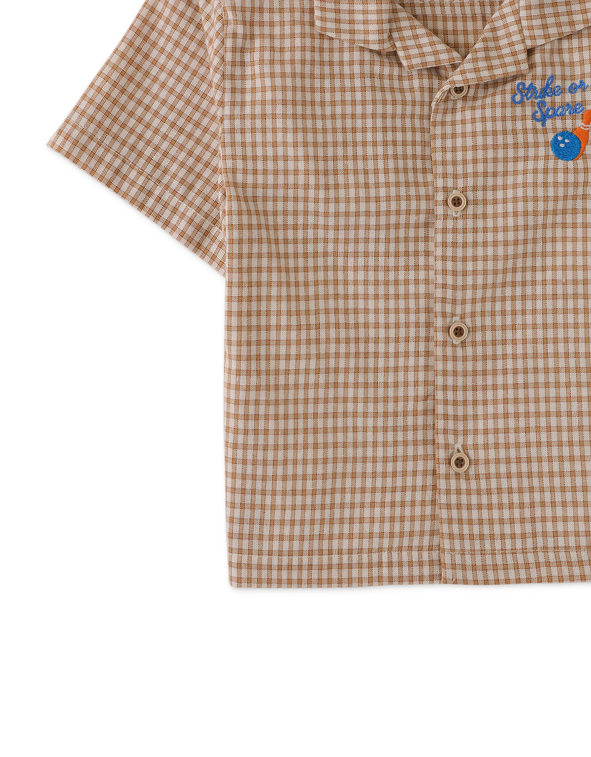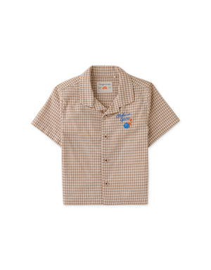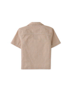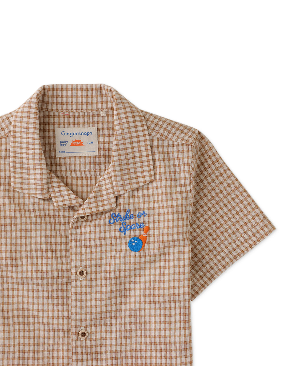 Your little boy will look like a retro star in this gingham retro bowling shirt in the cutest tan hue.