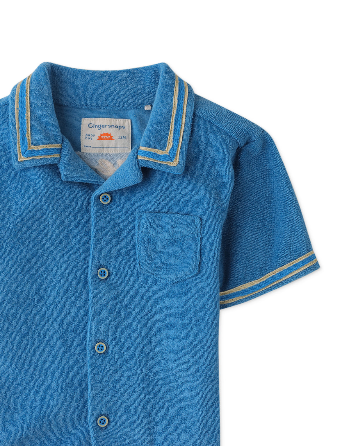 Your baby boy will look so adorable in this embroidered terry bowling shirt in a deep blue hue.