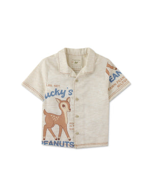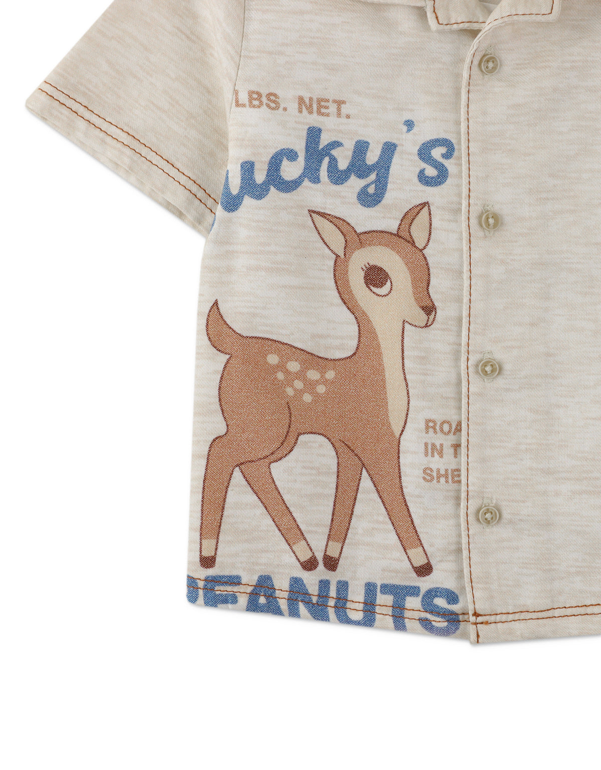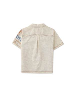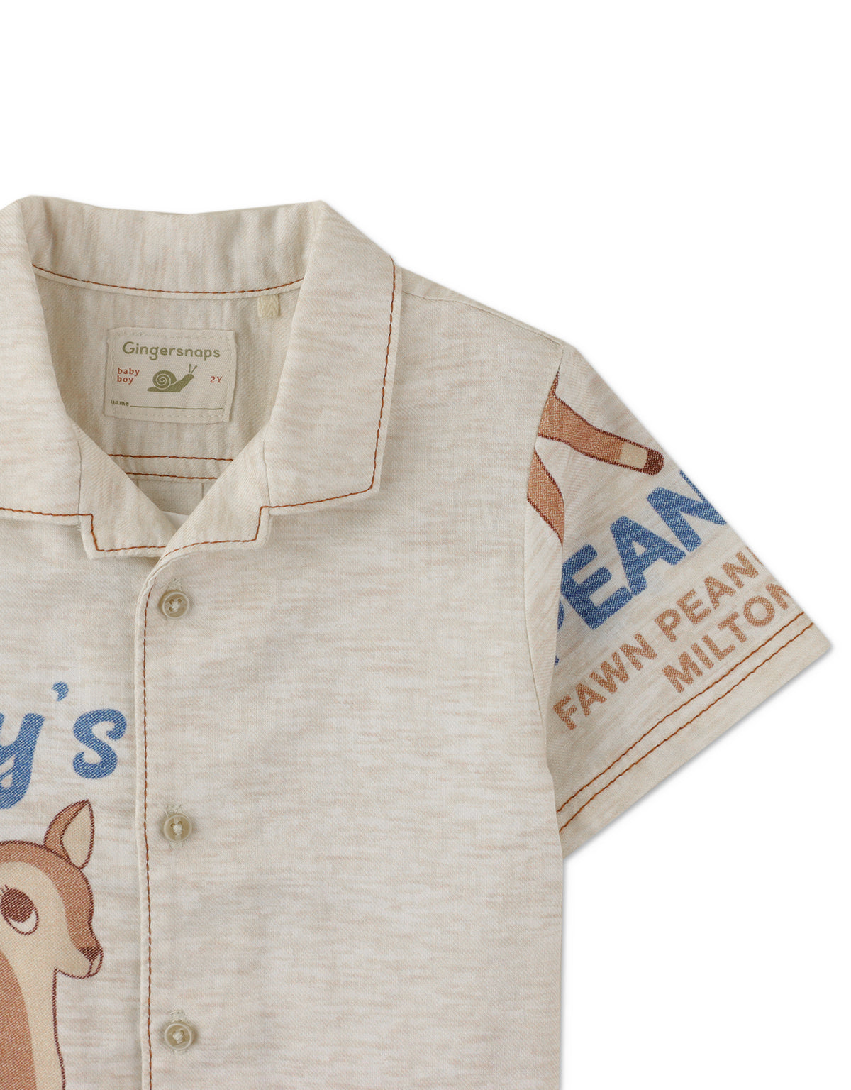 He will look adorable in this short-sleeve shirt with a playful old feed sack print!