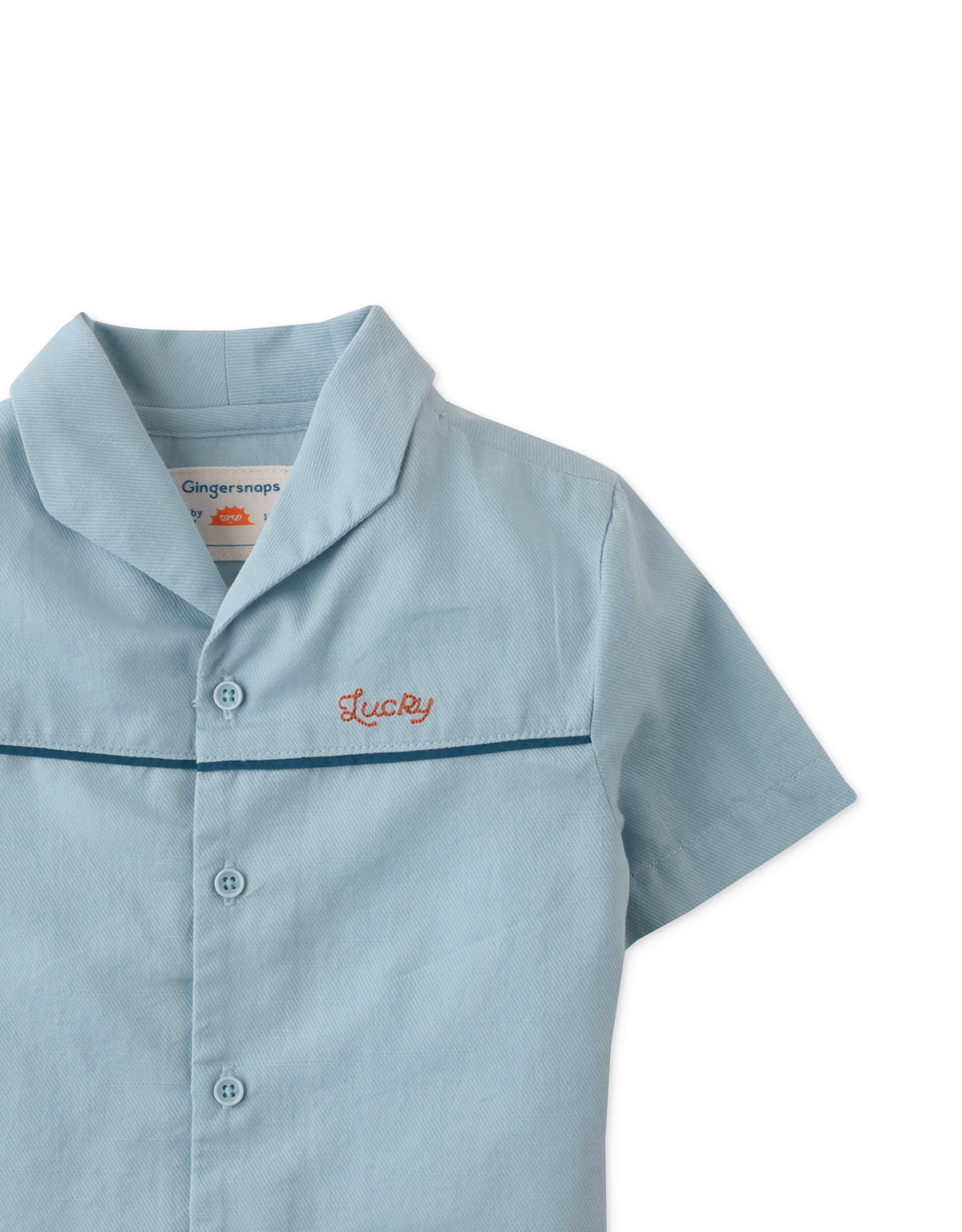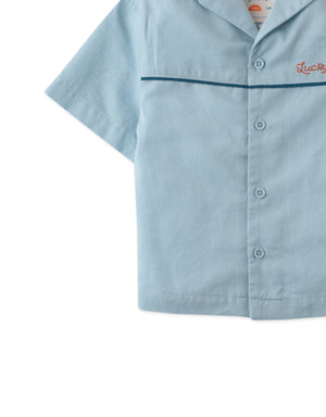 This adorable blue bowling shirt is adorned with a chenille patch for added cuteness to his look.