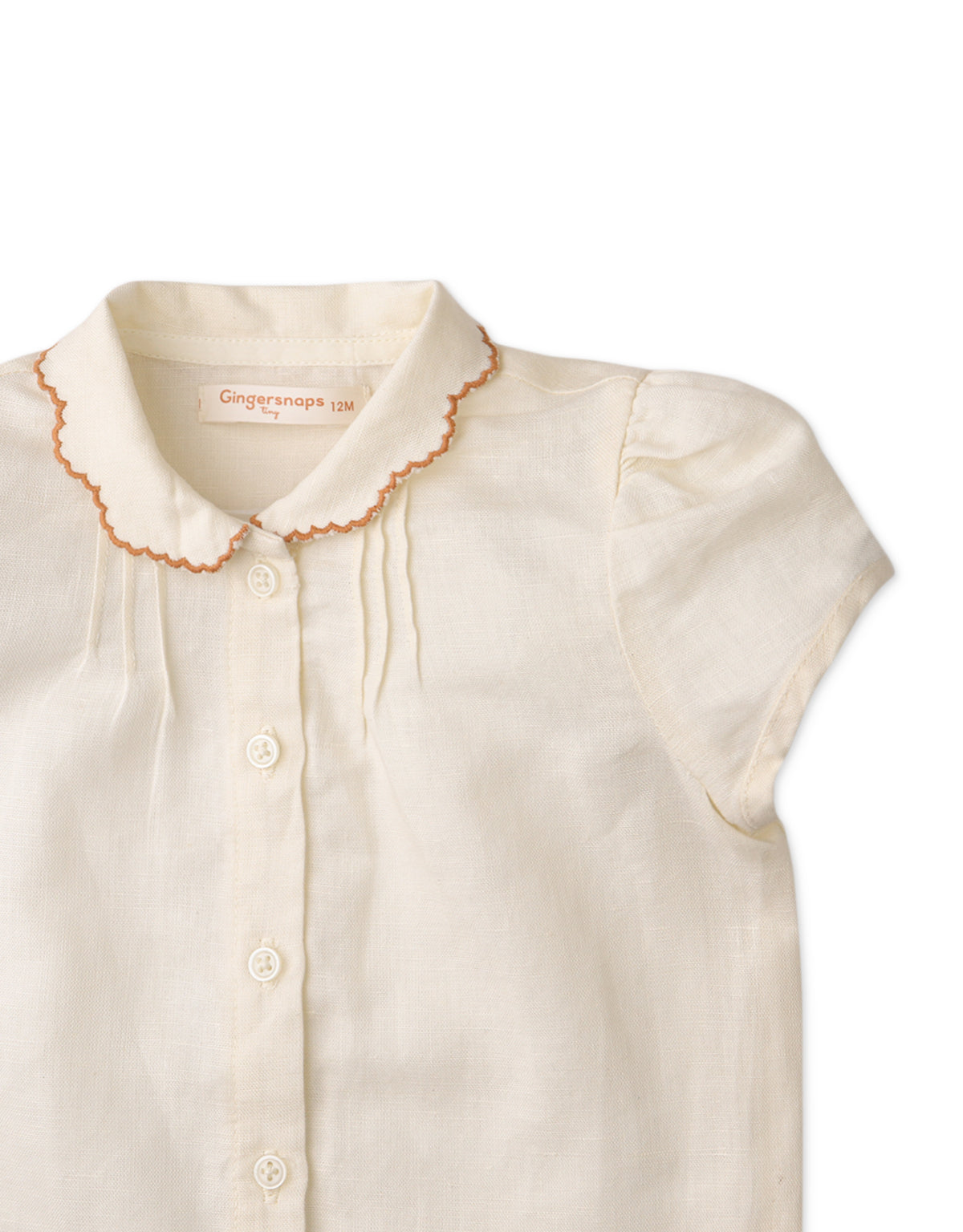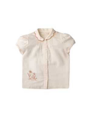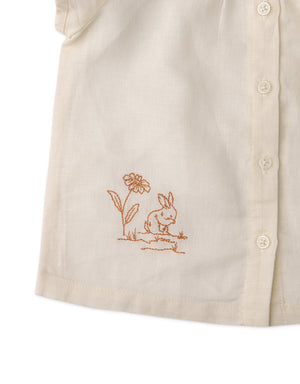 Celebrate simplicity with this white button-down blouse, embellished with a playful scalloped collar and the cutest bunny embroidery details!