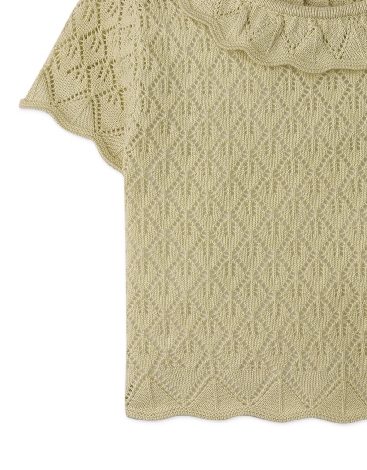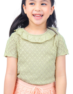 Explore the world in this pointelle knit blouse adorned with playful ruffles for added fun!