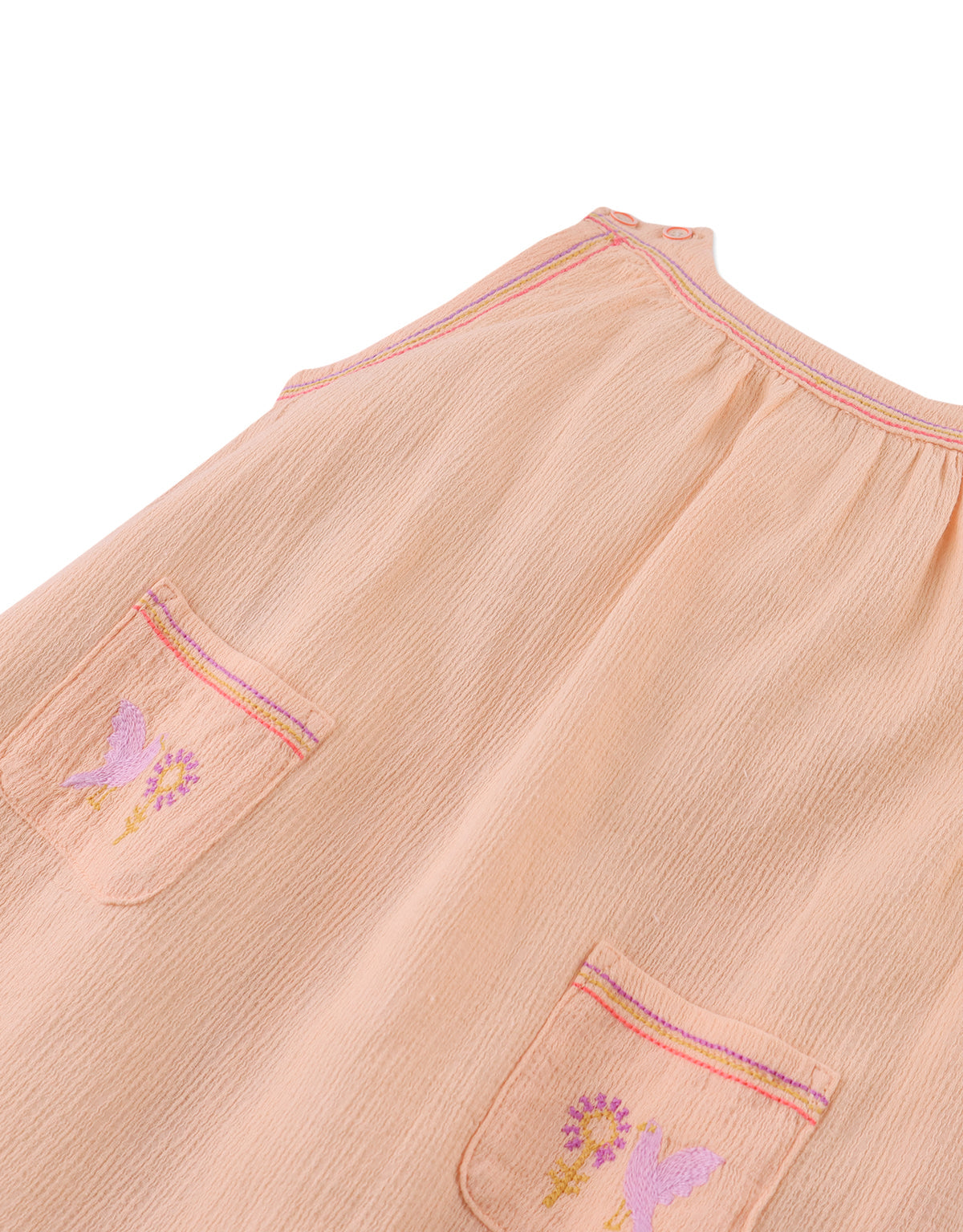 Infuse a touch of boho chic into her wardrobe with our peach Jelena dress featuring adorable pockets, perfect for tiny treasures on her stylish adventures.