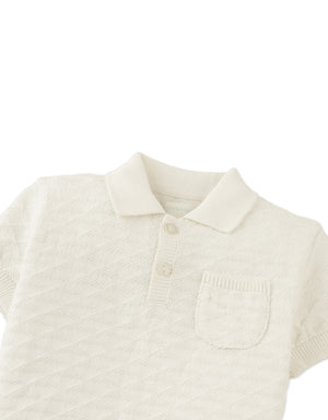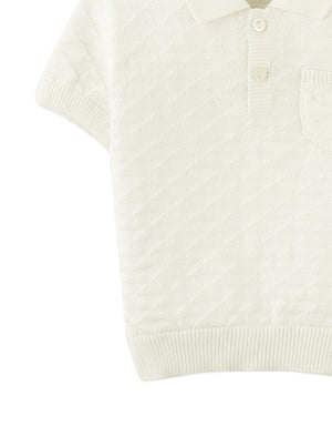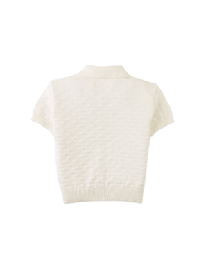 Keeping your little one effortlessly polished with this white short sleeve cable knit shirt with ribbed cuffs and hem. Featuring a continuous collar for a refined yet cozy look.