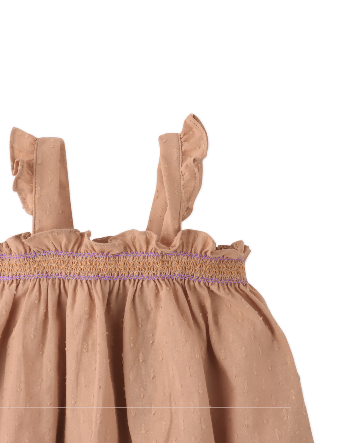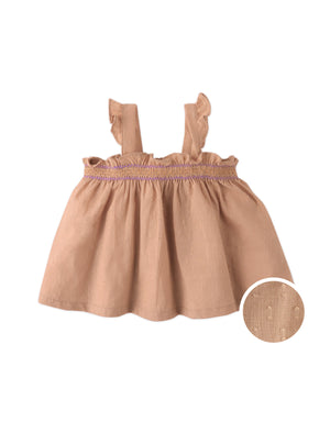 Your little lady will stay cool and stylish in this tan strappy textured cotton tunic, featuring delicate smocking details for a elegant touch.