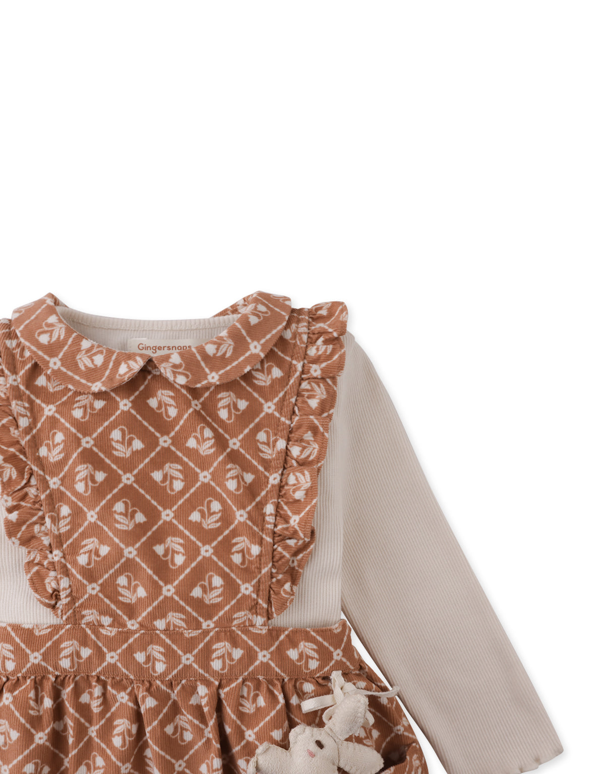 BABY SABRINA PINAFORE DRESS BROWNFIELDS WITH LONG SLEEVES INNER RIBBED TEE AND BUNNY PLUSHIE