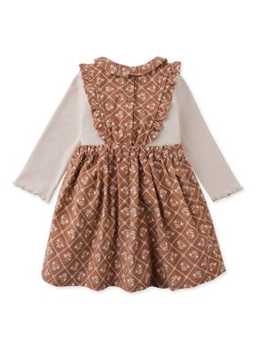 Let the Baby Sabrina Pinafore Dress in Brownfields pattern bring cozy comfort and playful joy, with its ribbed long-sleeve tee and an endearing bunny plushie as the perfect companio