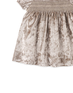 Dress your little princess in our Baby Selina Short Sleeves Smocked Dress in Goldsands, featuring a refined collar and delicate embroidery details for a sophisticated, timeless look.