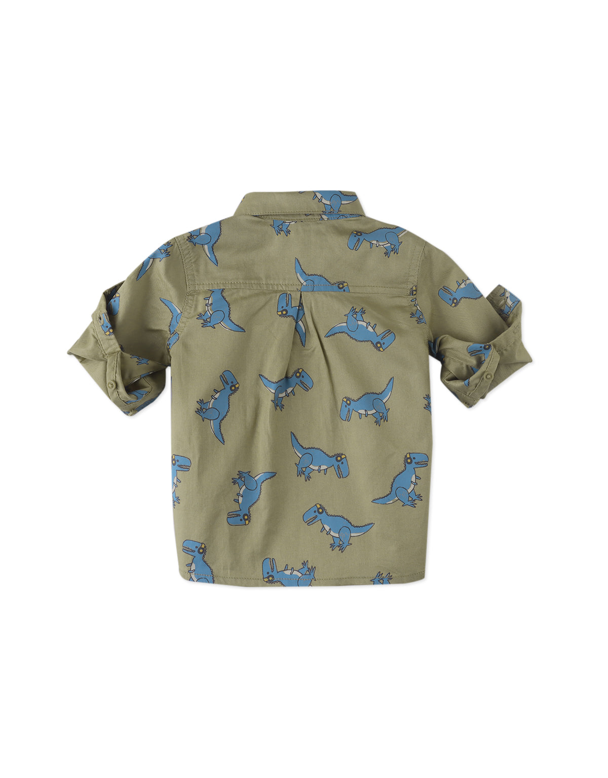 Add a playful pop to his outfit with our Baby Zeph Long Sleeves Shirt in khaki green, featuring our Rex Rave print.