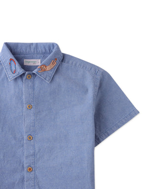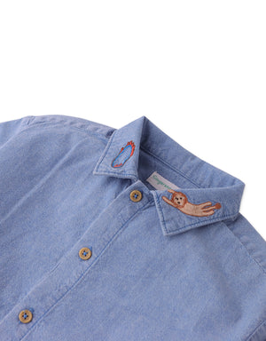 Embrace playful sophistication with our Elio soft denim shirt embroidered with lion and hoop details, for the added quirky circus motif.
