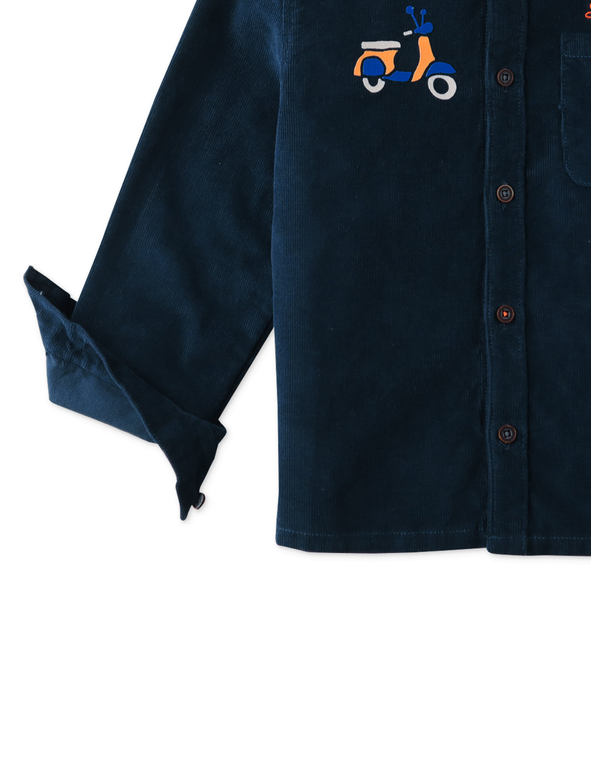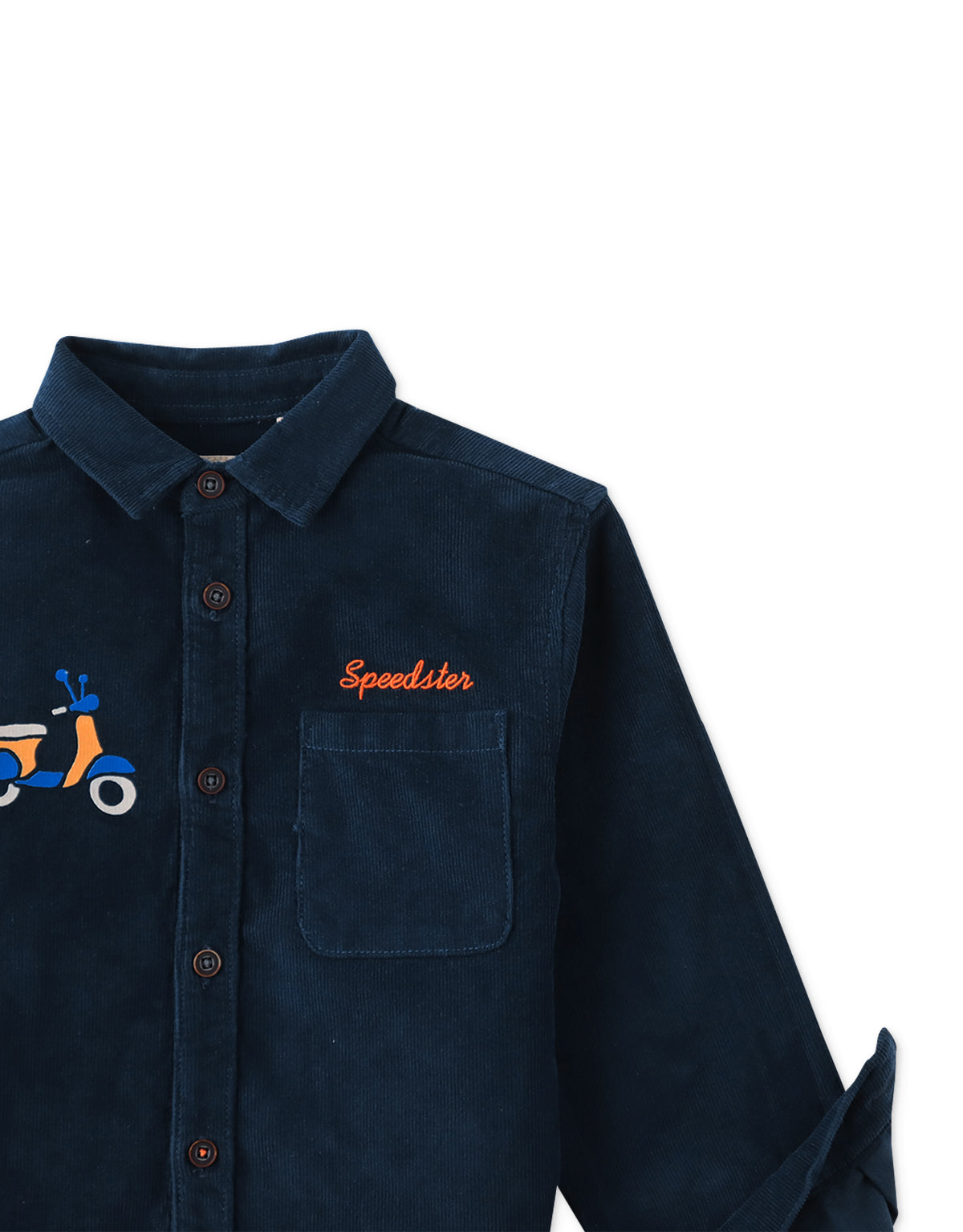 This flock print corduroy overshirt in a dark blue shade will ensure he looks cool all day.