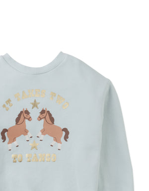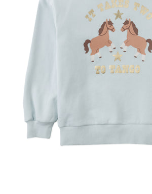 The Cheyenne Pullover in blue, featuring whimsical dancing horses and fringes reminiscent of western cowgirls, adds an energetic vibe to your little one’s wardrobe