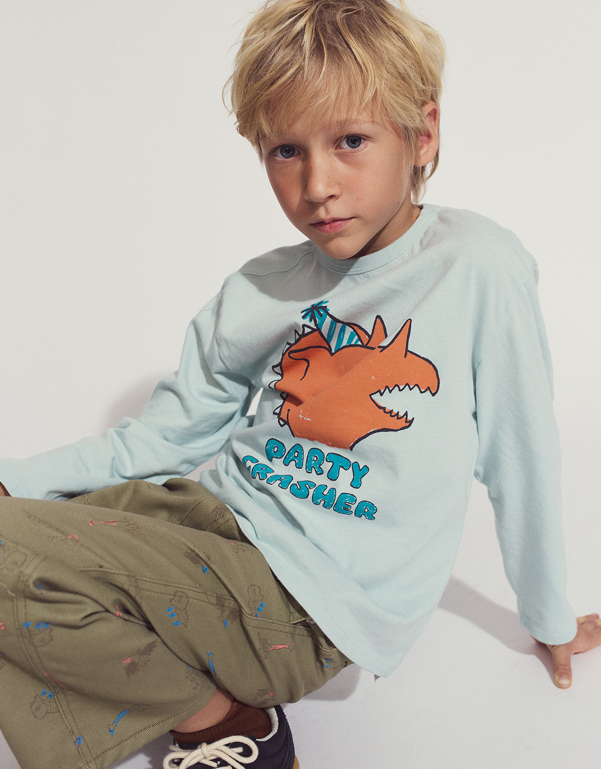 You little adventurer can surely crush it with our Dmitry Long Sleeves T-Shirt in Mist, featuring our wild Dino Crash print!