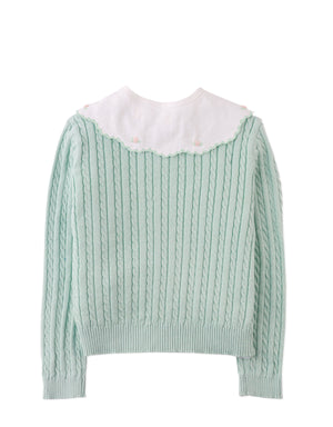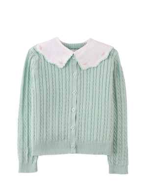 Classic style meets cozy charm with the Frida Cardigan in subtle green, featuring a bouillon embroidered contrast collar that adds a whimsical, rustic touch to your child's ensemble.