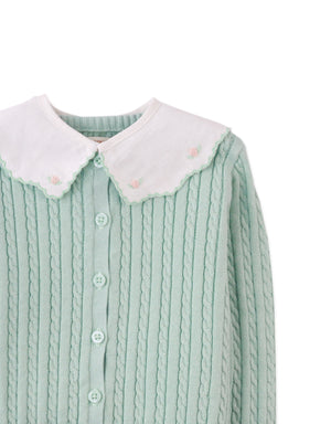 FRIDA CARDIGAN GREEN WITH BOUILLON EMBROIDERED CONTRAST COLLAR