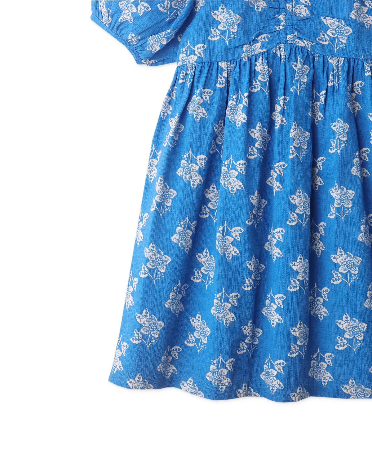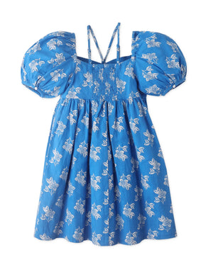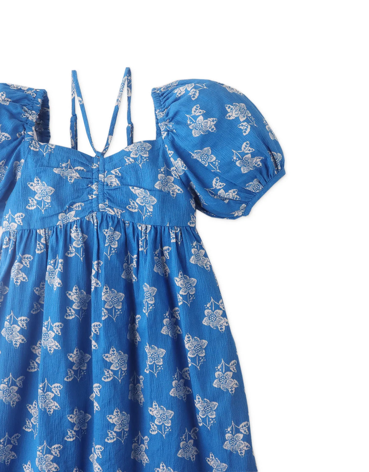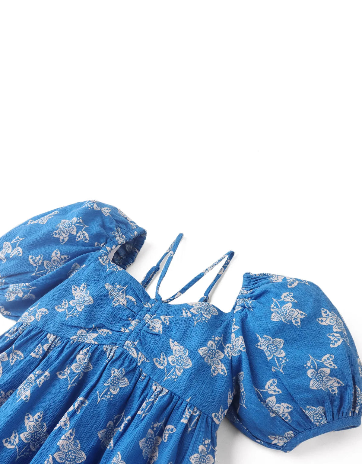 GIRLS BLOCKED PRINT PUFF SLEEVES DRESS WITH STRAPS