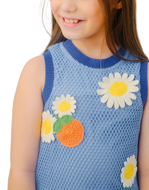GIRLS CROCHET DRESS WITH ORANGE AND FLOWER APPLIQUES