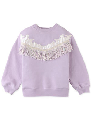 GIRLS FLEECE PULLOVER WITH APPLIQUE AND FRINGES ON FRONT