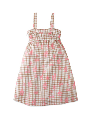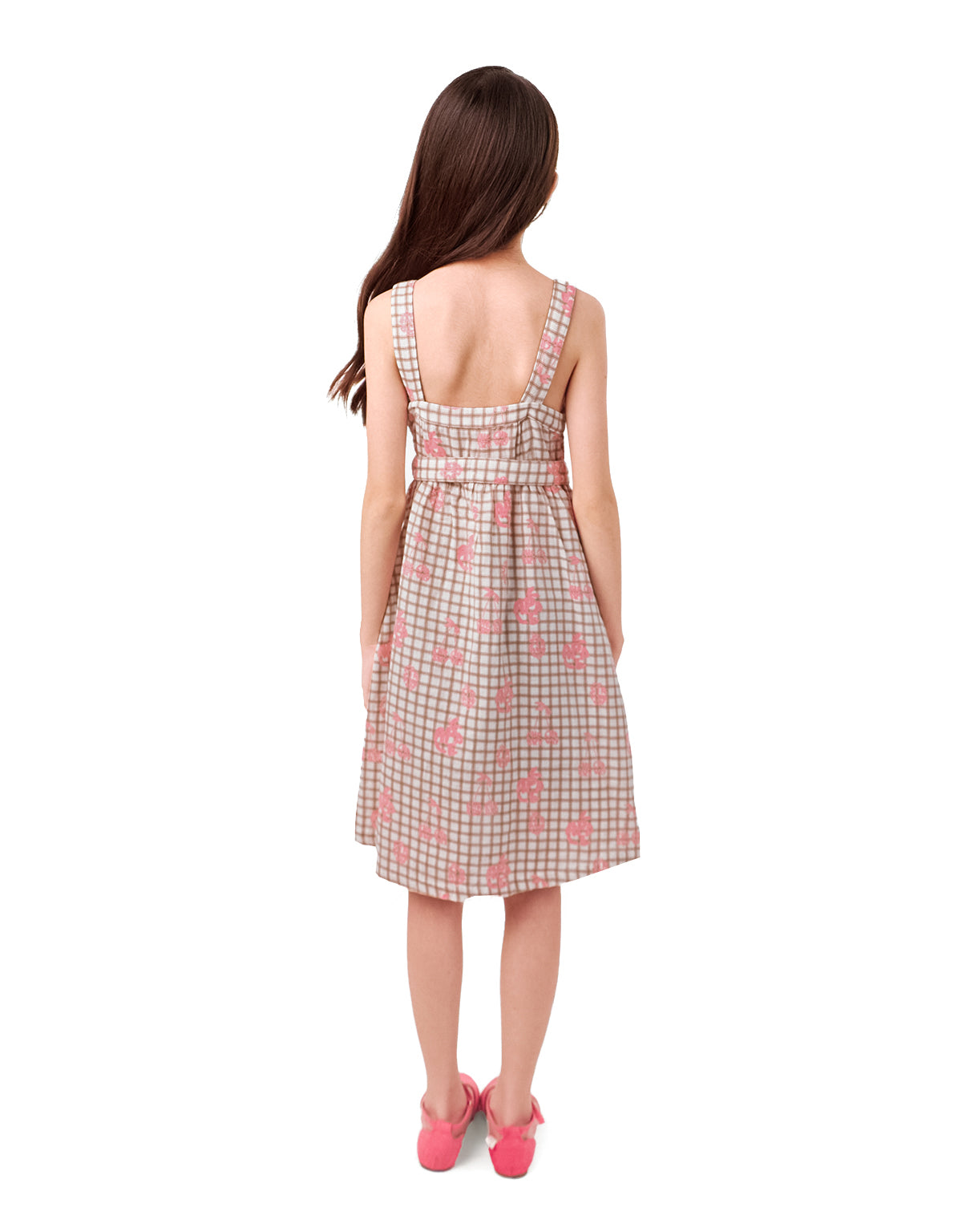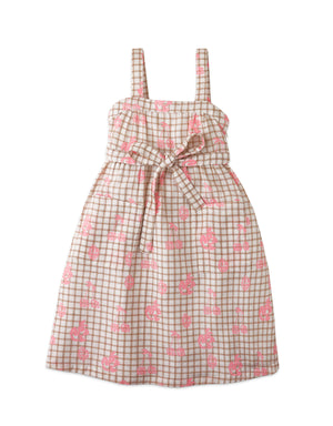 GIRLS GRID AND FRUIT PRINT STRAPPY DRESS WITH TIES