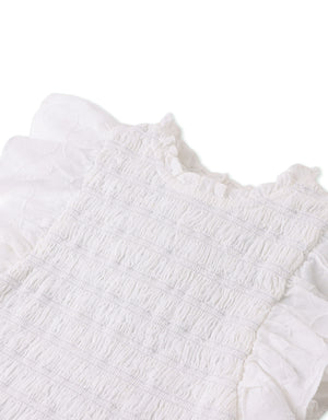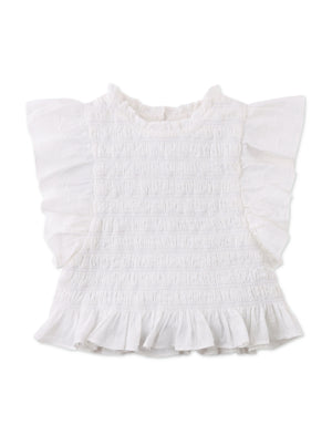 This Jacquie smocked top with peplum ruffles and hem will add a delightful flair to your little fashionista's wardrobe. Pair it with our Jacquie smocked shorts to elevate her everyday ensemble with playful charm.