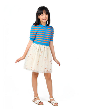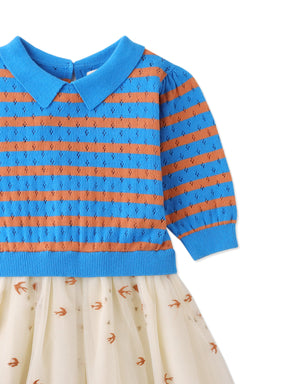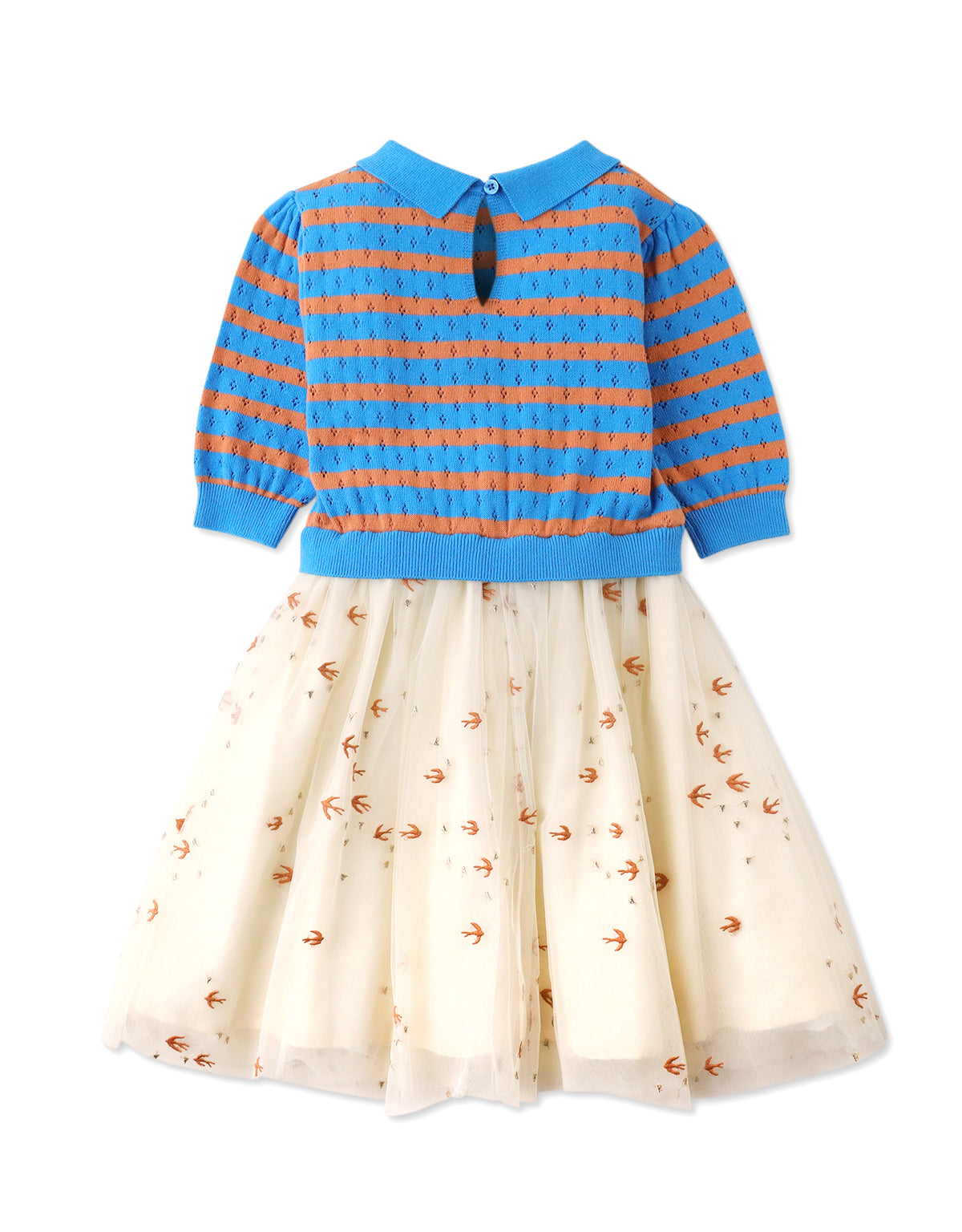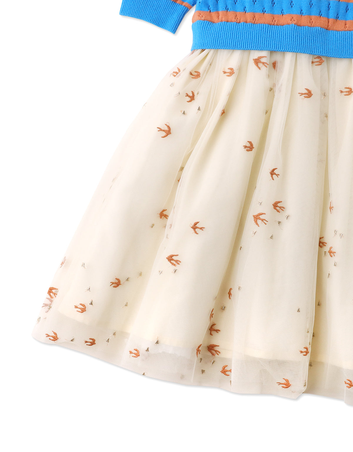 Dive into a world of timelessness with this striped knit bodice dress with adorable bird embroidery and a classic tulle skirt!