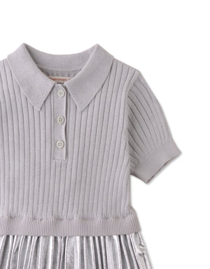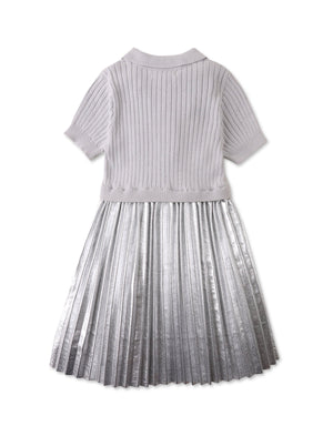 Embrace elegance with this knitted collared dress with a glitzy metallic pleated skirt!