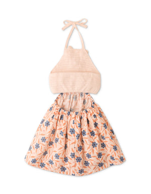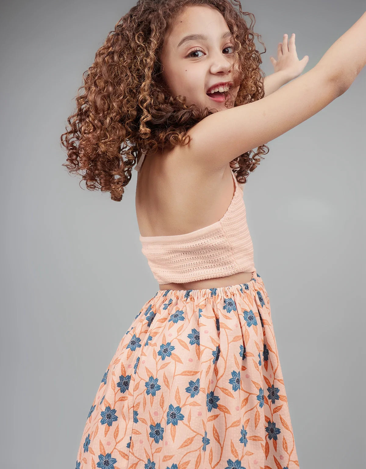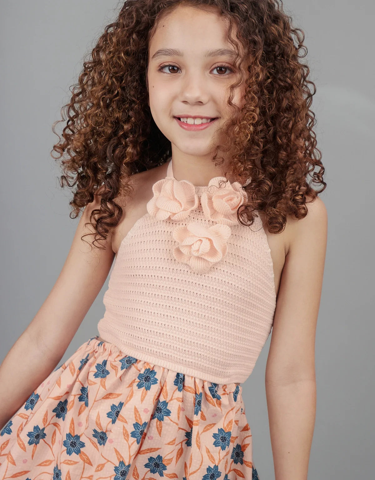 GIRLS KNITTED HALTER BODICE WITH CROSAGES DRESS AND BATIK LIKE PRINT FLORAL SKIRT