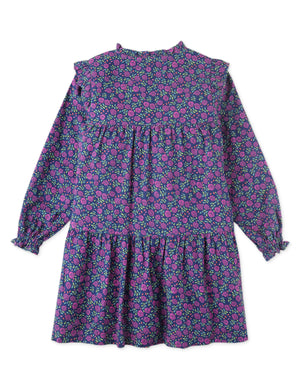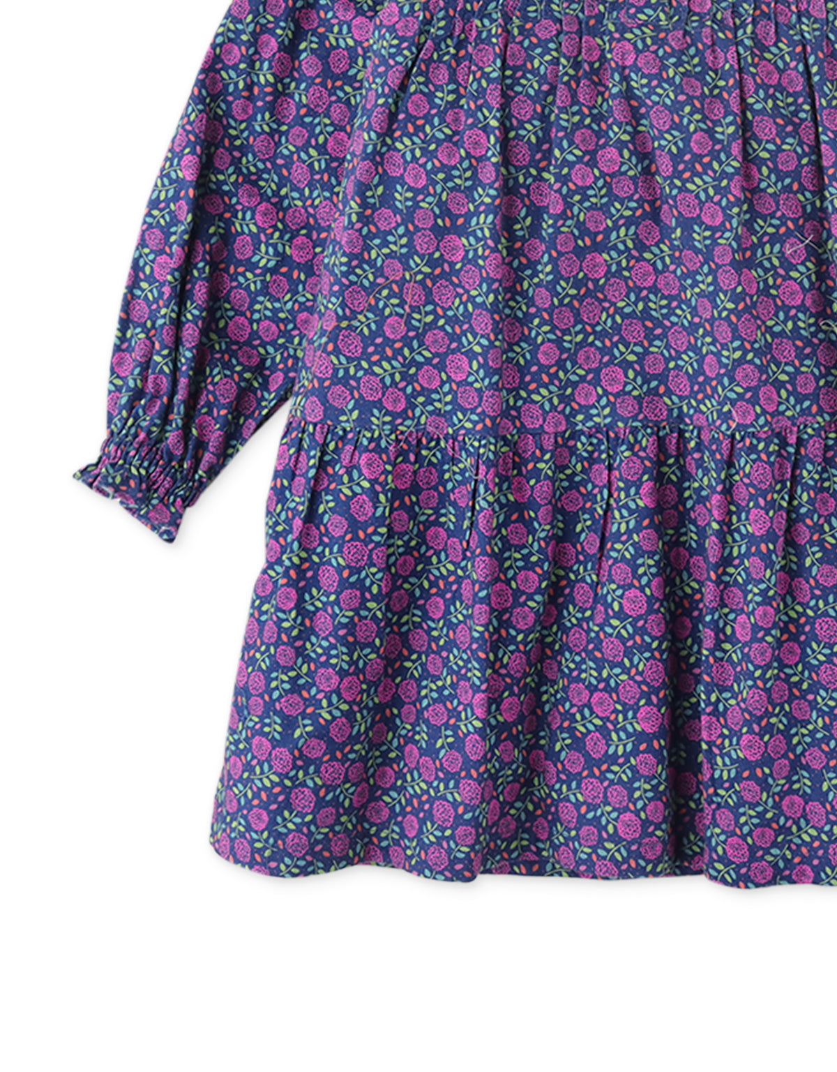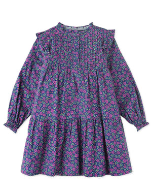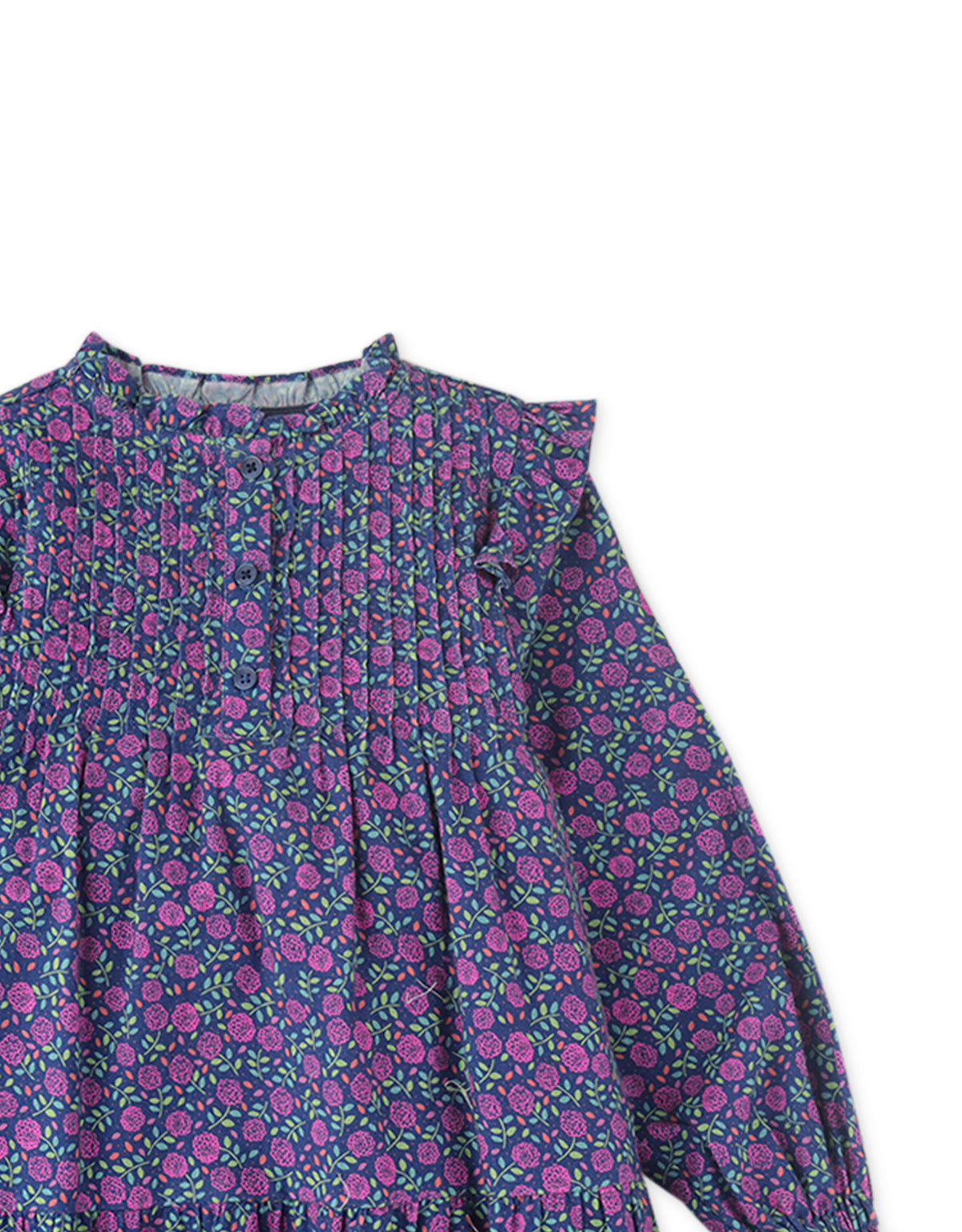 GIRLS PRINTED DRESS WITH RUFFLE DETAILS AND PLEATS ON CHEST
