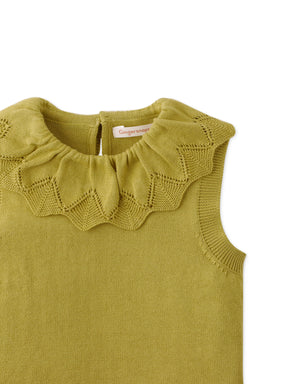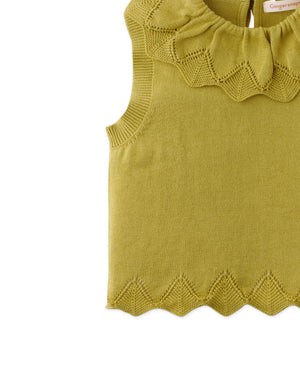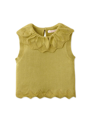 Look absolutely adorable in this knit sleeveless top adorned with the sweetest scalloped edges and a playful ruffle collar!