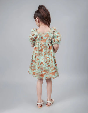 GIRLS SMOCKED BODICE DRESS WITH RUFFLE AND BUBBLE SLEEVES