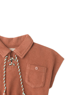 GIRLS TERRY TOWEL COLLARED TOP WITH 2-TONE TIES AND POCKET DETAIL