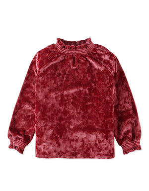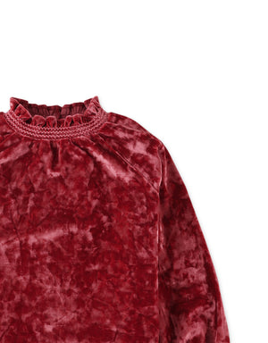 GIRLS VELVET TOP WITH SMOCKED EMBROIDERY ON NECK AND CUFFS