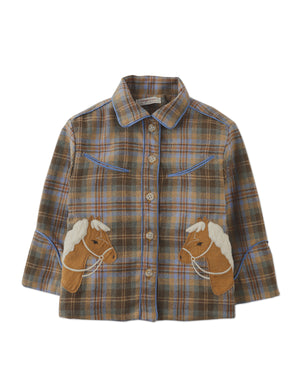The Isadora Shirt Jacket in Wyeth plaid, with its contrast inserts and playful horse appliqués, blends country charm with modern flair for a stylish, versatile piece perfect for any occasion.