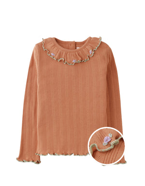 JENNY LONG SLEEVES TEE TAN WITH EMBROIDERED RUFFLED COLLAR