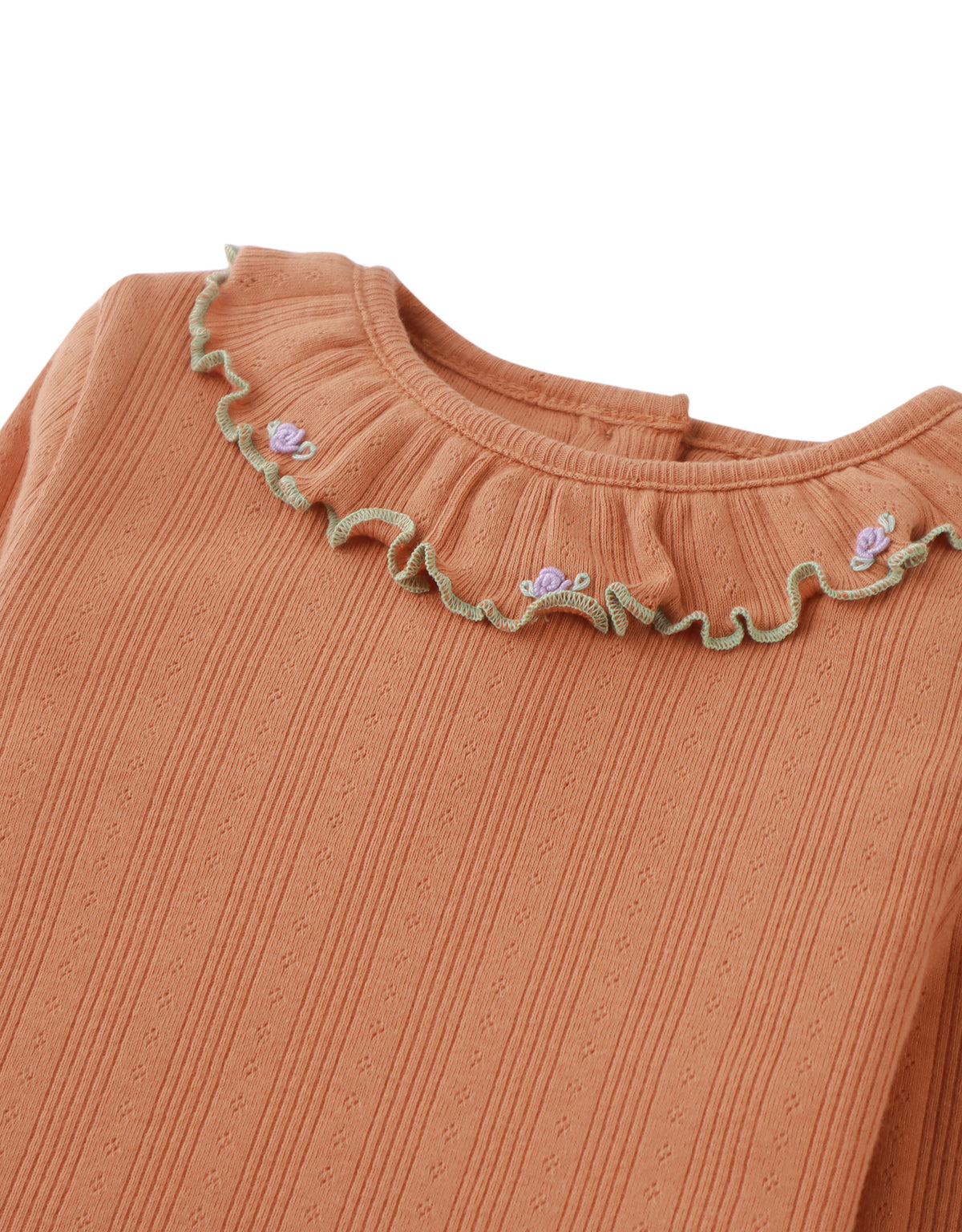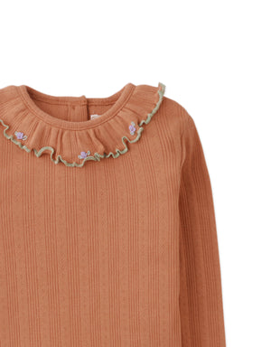 Dress your little one in the Jenny Long Sleeves Tee in Tan, featuring an embroidered ruffled collar for a sweet, vintage-inspired look.