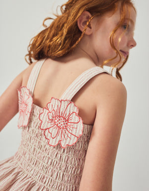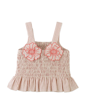 Brimming with carefree charm, this Pink peplum top in light striped seersucker features a smocked bodice and floral appliqué—perfect for twirls, giggles, and a touch of sunshine.