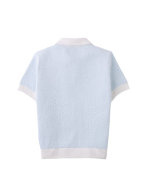 Dress your little one in this stylish 2-tone starlight blue and brilliant white jacquard knit short sleeve polo, featuring an open placket and ribbed details for a casual yet sharp appearance.