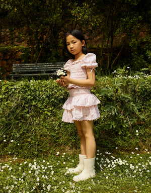 Fit your little darling in this pink pinstriped smocked top, blooming with rose prints and finished with wide neck ruffles, puff sleeves, and a peplum hem. With its dainty silhouette, it’s a go-to for days that call for a touch of playfulness.