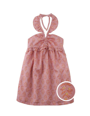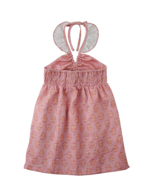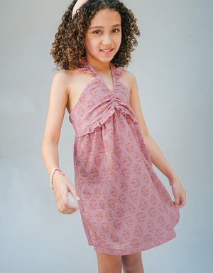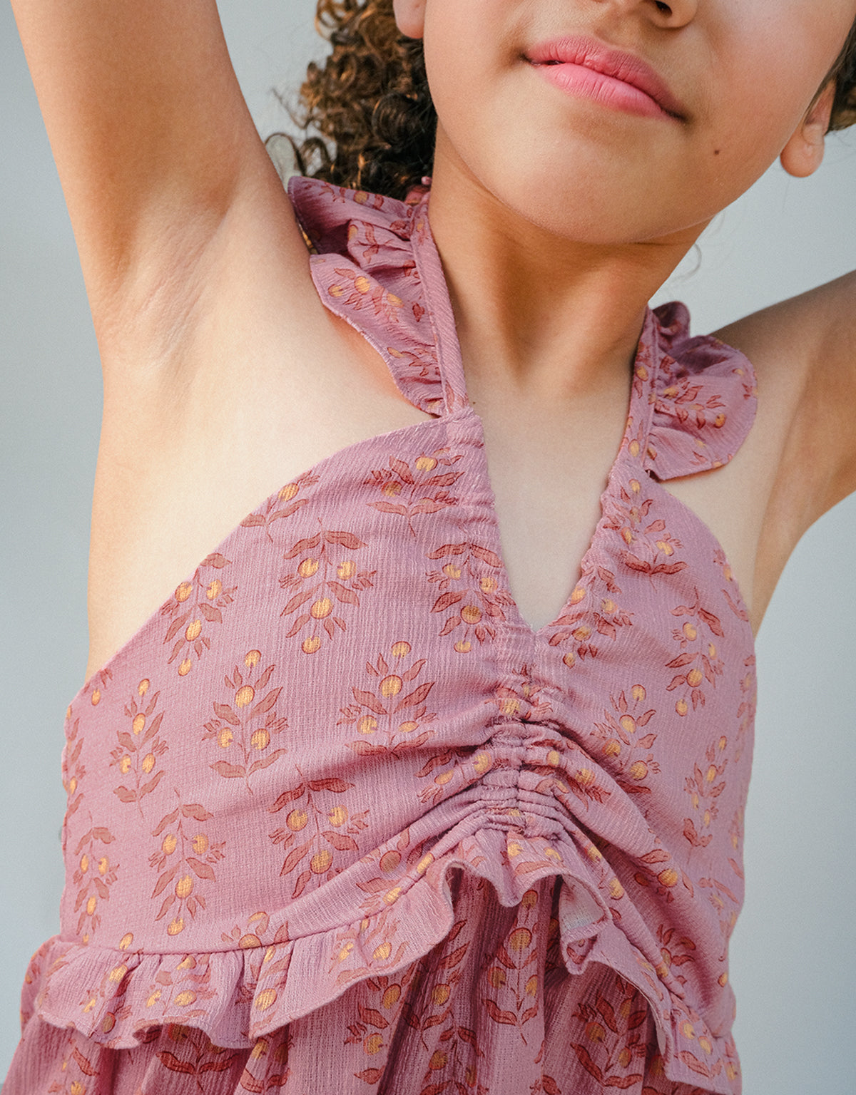 Embracing a carefree spirit, this cheesecloth halter dress flows with ruffles and a delicate floral print, perfect for your little one's sunny-day adventures.