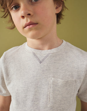 Fit your little one in this soft short sleeve ringer tee, available in grey or offwhite, and complete with a chest pocket that adds a playful and practical element to their look.