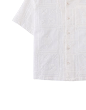 Embracing a casual, yet refined style, this white embroidered camp collar short sleeve button-down shirt adds a unique flair to your child's collection.
