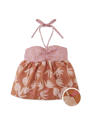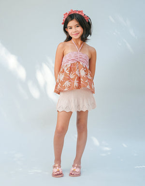This printed sweetheart neck halter top brings a fun and charming touch to any outfit, keeping your little sunshine stylish and adorable.