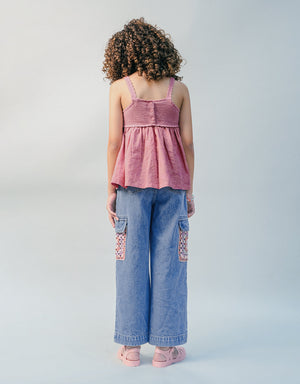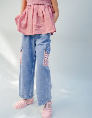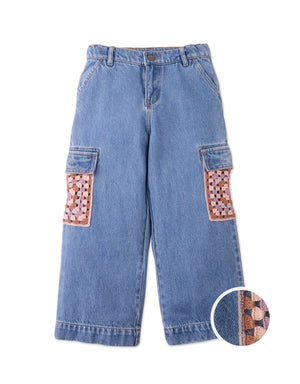 Crafted for both adventure and style, these denim cargo pants showcase multicoloured patterned crochet pockets for a look as unique as your little one.