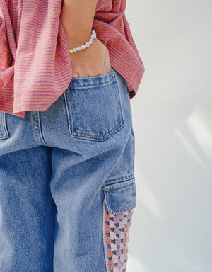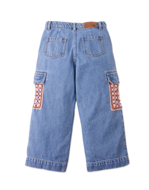 VIVIENNE DENIM CARGO PANTS WITH MULTICOLOR CROCHET POCKETS