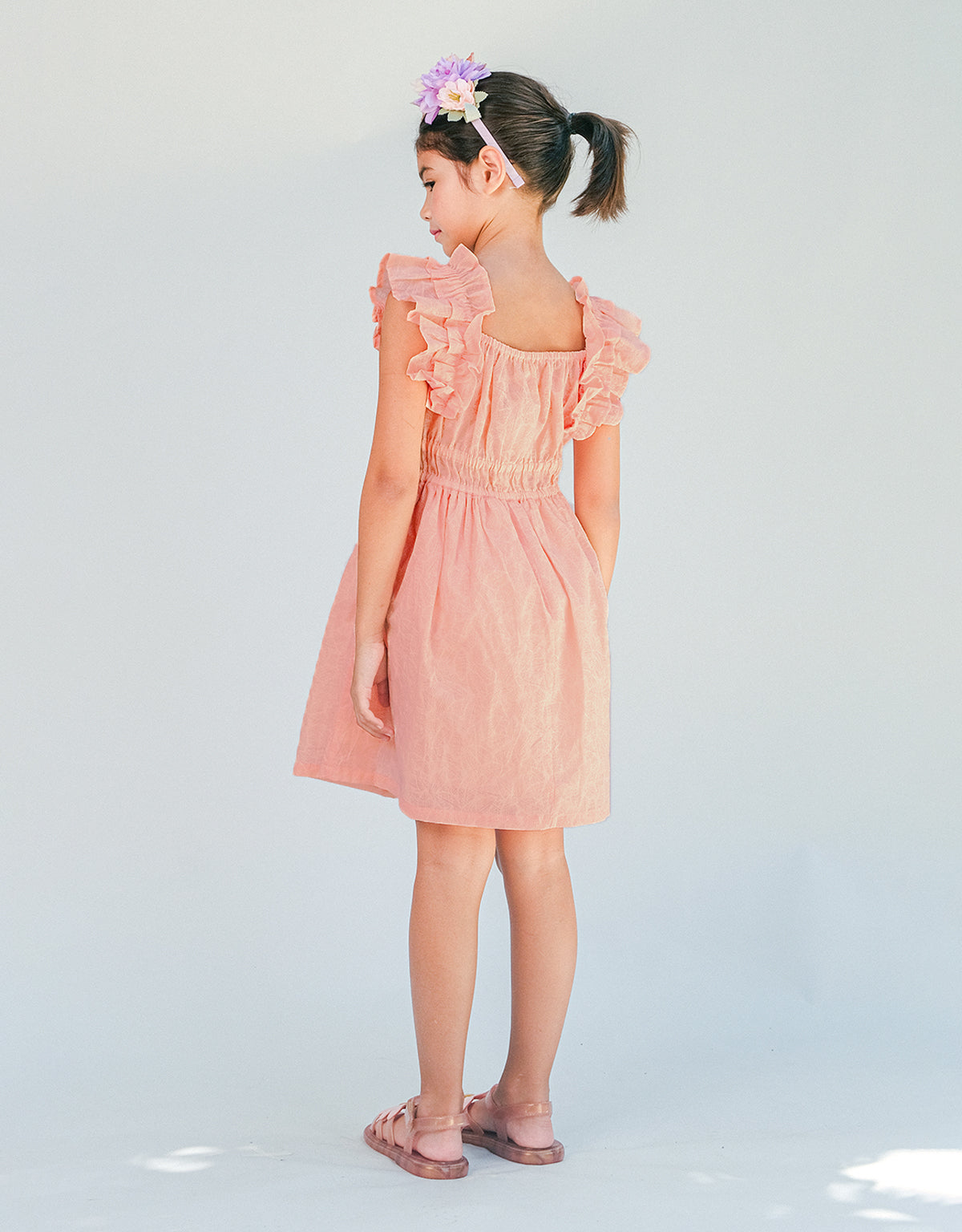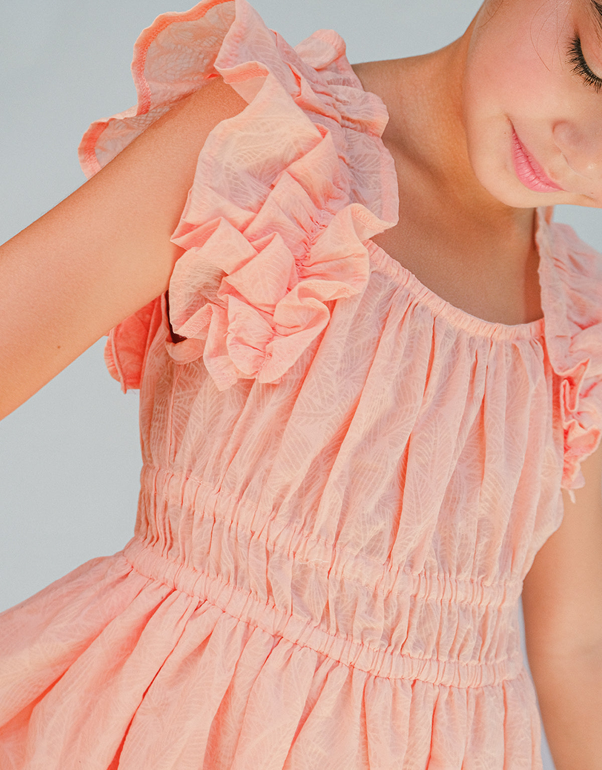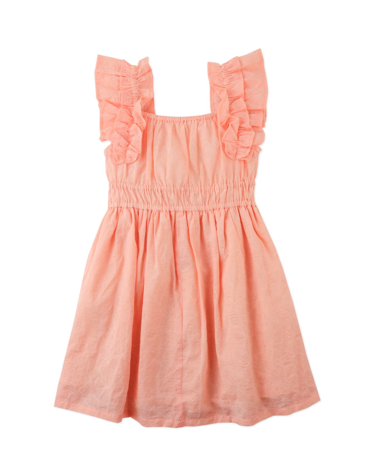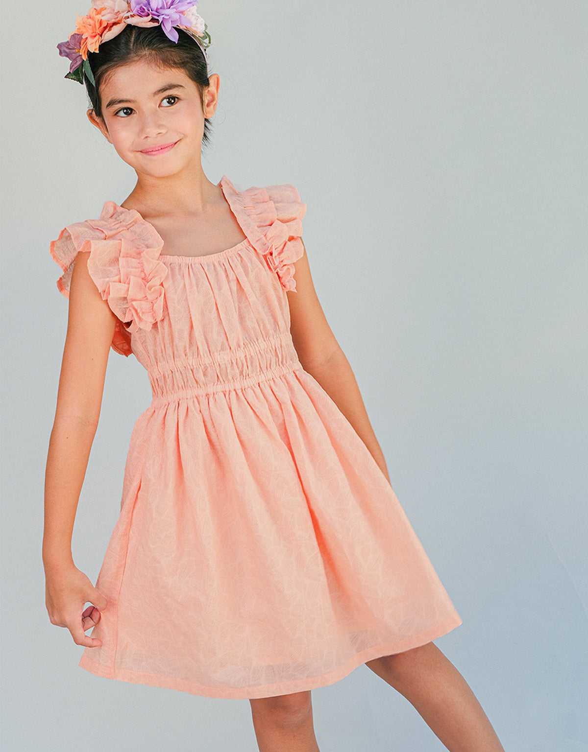 Blooming with effortless charm, this peach floral textured dress pairs a smocked waist with soft ruffle sleeves for a look as delightful as your sweetheart.